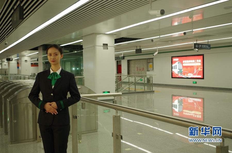 地鐵2號(hào)線的工作人員身著“榕城綠”服飾,與1號(hào)線的“幸福紅”相互呼應(yīng)。新華網(wǎng) 張婷婷 攝