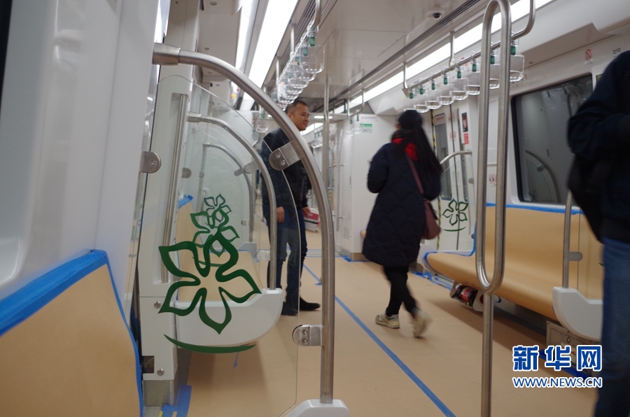 福州地鐵2號(hào)線線路設(shè)計(jì)以“綠色榕城 清新福州”為主題,“榕城綠”貫穿于整個(gè)車(chē)輛設(shè)計(jì)中。圖為列車(chē)座位透明擋板上裝飾的茉莉花圖標(biāo)。新華網(wǎng) 張婷婷 攝