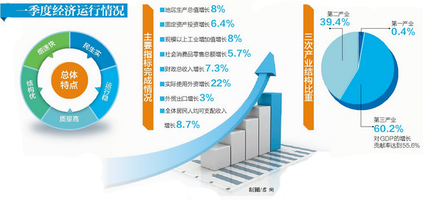 地區(qū)生產(chǎn)總值快速增長(zhǎng),經(jīng)濟(jì)結(jié)構(gòu)轉(zhuǎn)型升級(jí)。數(shù)據(jù)顯示,一季度GDP增速較去年同期提高0.5個(gè)百分點(diǎn),增幅比1-2月提高1.2個(gè)百分點(diǎn),經(jīng)濟(jì)三次產(chǎn)業(yè)結(jié)構(gòu)為0.4∶39.4∶60.2,第三產(chǎn)業(yè)占比超過(guò)60%,對(duì)GDP的增長(zhǎng)貢獻(xiàn)率達(dá)到55.6%。工業(yè)成色不斷刷新,規(guī)上高新技術(shù)產(chǎn)業(yè)在規(guī)上工業(yè)中的占比高達(dá)67.1%!盎ヂ(lián)網(wǎng)+零售”增長(zhǎng)33.0%,網(wǎng)上零售額占限上社會(huì)消費(fèi)品零售額的29.1%。信息傳輸、軟件和信息技術(shù)服務(wù)業(yè)等重點(diǎn)服務(wù)業(yè)快速成長(zhǎng)——新產(chǎn)業(yè)、新業(yè)態(tài)、新模式不斷壯大,經(jīng)濟(jì)結(jié)構(gòu)更趨優(yōu)化。