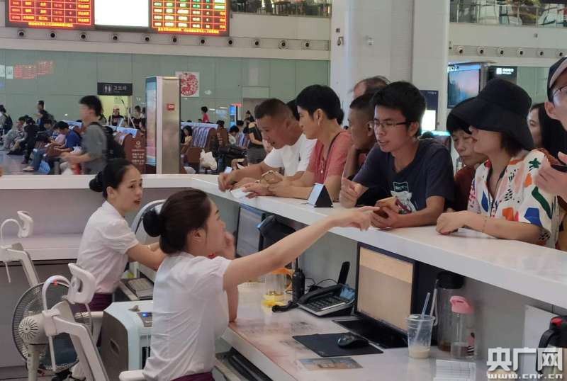 黨員志愿者陳濤舉著小喇叭,將一批批旅客從候車室里帶到售票大廳里!罢埓蠹业綉蓖似贝翱谂藕藐,有序辦理退票或改簽!”陳濤維持著退票的隊伍。這樣的喇叭聲,也在候車大廳里不停的滾動播出,嬌小的個子,甜美略帶嘶啞的聲線,服務臺客運員高靖透過高音喇叭廣播:“Z60次的旅客們請集合,今日列車因暴雨臨時停運,我們將帶大家到一樓售票大廳辦理全額退票或改簽手續(xù)!避囌究瓦\職工始終奮戰(zhàn)在第一線,努力安撫旅客情緒。