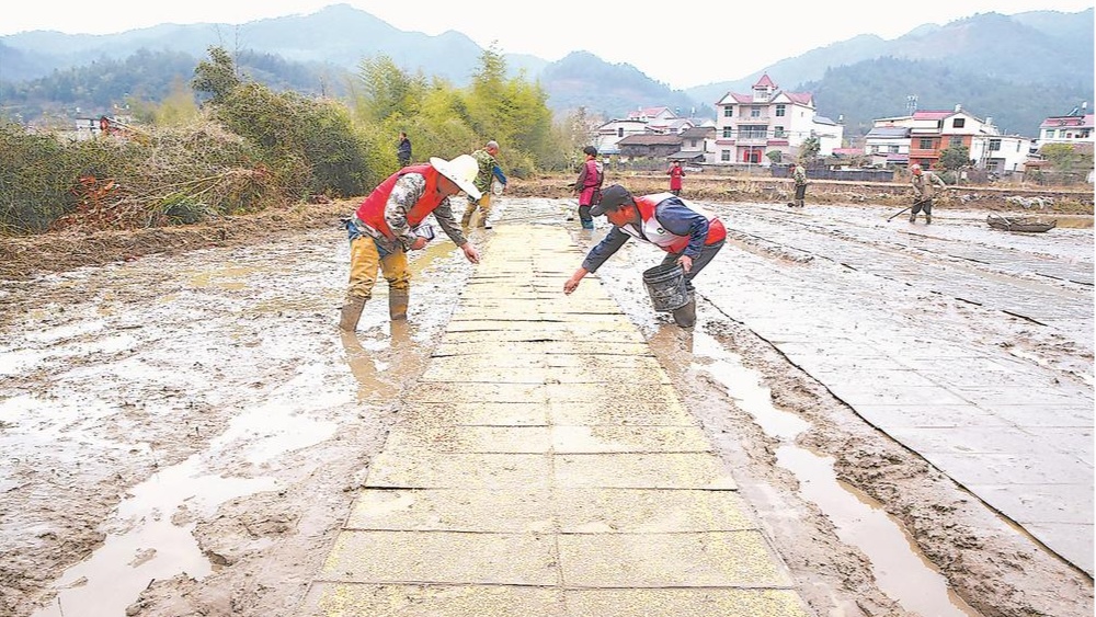 臺企南平市臺香生態(tài)農業(yè)發(fā)展有限公司位于邵武市水北鎮(zhèn)龍斗村的水田里,村民在科技特派員的指導下,修整秧苗床,播撒優(yōu)質超級稻種子。