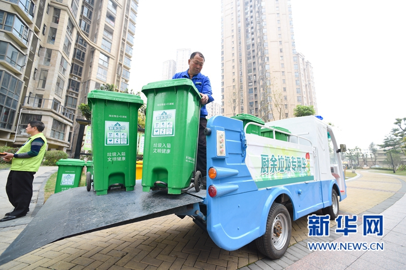 3月29日,廈門市天湖城小區(qū)保潔員楊永生在收集廚余分類垃圾。 新華社記者姜克紅攝 -