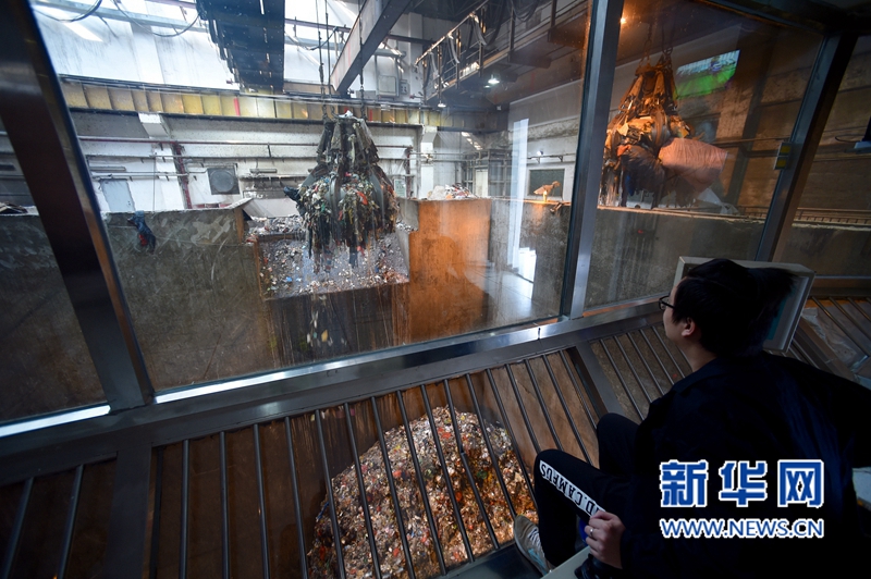 3月28日,廈門市后坑垃圾焚燒發(fā)電廠工人在操作儀器抓運垃圾進焚燒爐燃燒發(fā)電。 新華社記者姜克紅攝 -