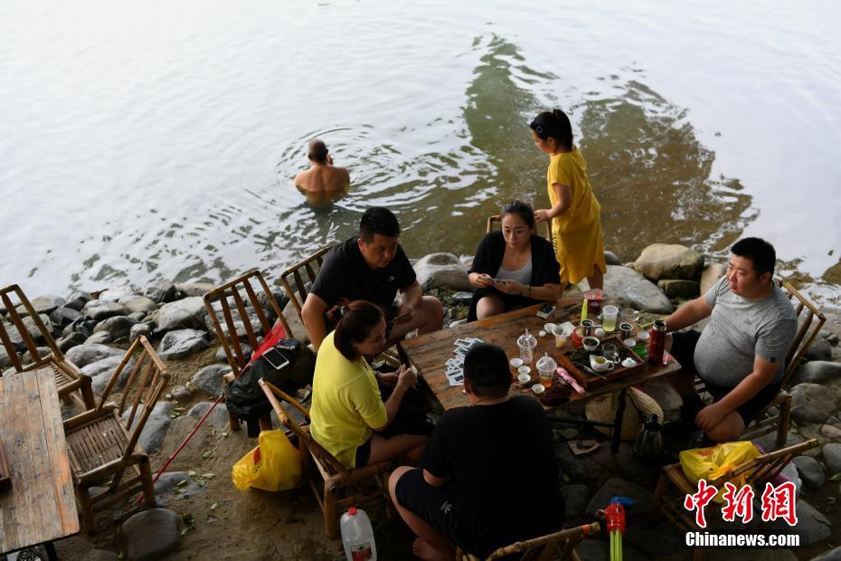 游客在溪邊悠閑的打牌娛樂(lè)。王東明 攝 -