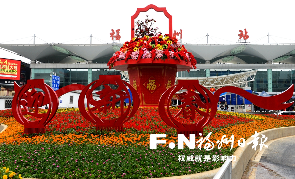 昨日,福州火車站南廣場(chǎng)外的花圃上,一個(gè)碩大的紅色花籃擺放在正中央,四周上千盆各色鮮花點(diǎn)綴,以燈籠造型的“迎新春”三個(gè)大字烘托出喜慶的節(jié)日氛圍,不少旅客拿出手機(jī)拍照留念。漸濃的年味,也加快了旅客返鄉(xiāng)的腳步。