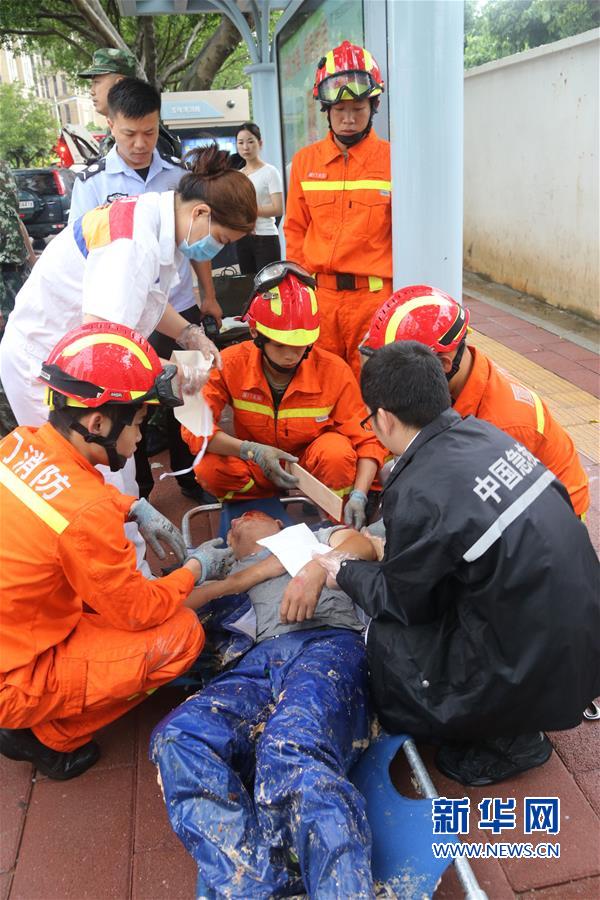 5月7日,在廈門市五緣灣路,倒塌的圍墻壓住一名行人,消防官兵和醫(yī)護(hù)人員為其緊急救護(hù)。新華社發(fā)(曾德猛 攝)