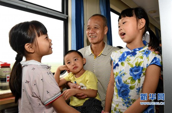 7月8日,在福州開往北京西的Z60次列車上,一位爺爺帶著孫子孫女前往北京與在外工作的孩子父親團聚。