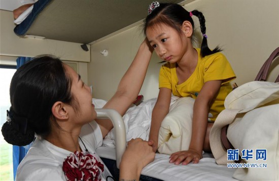 7月8日,在福州開往北京西的Z60次列車上,乘務(wù)員在照顧一位父母在北京工作的小朋友。進入暑期,眾多小“候鳥”踏上旅途,回到在外工作的父母身邊,開始短暫的暑期生活。 新華社記者張國俊攝