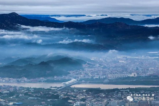 沿江而下,視角平移,泉州軟件園方向,可見雙陽山高聳入云,山頭隱沒在云霧之中。