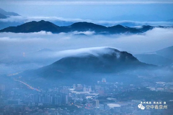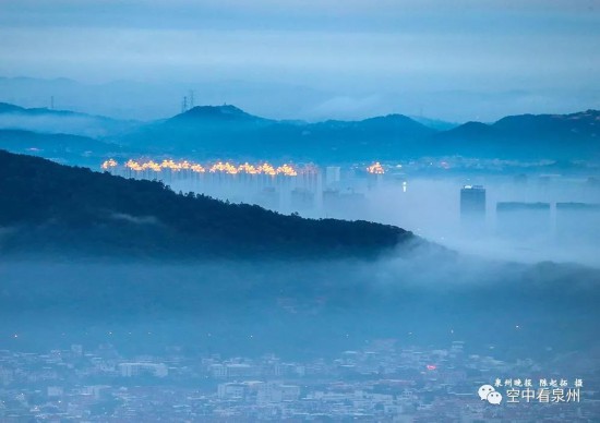 上圖:3月9日傍晚,雨水初歇,從晉江紫帽山往泉州中心市區(qū)方向眺望,平流霧猶如薄紗,將這座城市打扮出朦朧美。