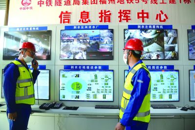 ▲ 起自閩侯荊溪鎮(zhèn)的福州地鐵5號線正在加快施工。圖為工作人員通過指揮中心進行施工調(diào)度。林鑫 攝
