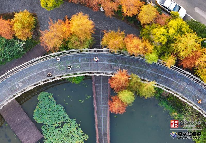 記者在梅峰山地公園內(nèi)看到,成片池杉沿棧道蔓延,燦爛的黃、熱情的紅、青翠的綠相互交織,構(gòu)成了一幅五彩斑斕的畫(huà)卷。沿著福道在半空俯視,一層層鋪展開(kāi)來(lái)的池杉襯著清澈的湖水,宛如一幅浪漫華美的油畫(huà)。