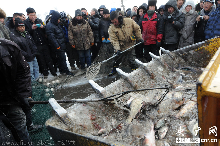 2014年12月28日,冰城哈爾濱市道里區(qū)首屆長(zhǎng)嶺湖冬捕冰釣旅游節(jié)在長(zhǎng)嶺湖國(guó)際冰釣場(chǎng)開幕,在冬捕區(qū),500米長(zhǎng)的“拉網(wǎng)”在漁民和拖拉機(jī)的共同努力下被緩緩拉出冰面,圖為“拉網(wǎng)”拉出冰面,各種魚紛紛露出水面,將魚放入鏟車斗里。