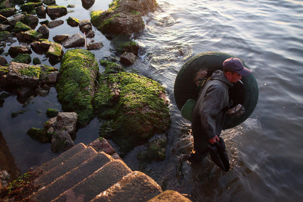 清晨,山東省青島市棧橋沿岸,近期是落潮季,海水水位比較低,幾位市民結(jié)伴攜帶潛水裝備和輪胎改造的橡皮筏來到海邊,準(zhǔn)備向大海獲取一份豐厚的獎(jiǎng)勵(lì)——海鮮。老趙扛著由輪胎改造而成的橡皮筏下水。
