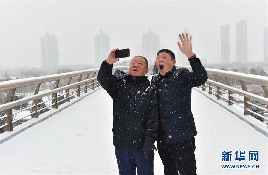2月21日,兩位太原市民在大雪中自拍。當(dāng)日,山西省氣象局發(fā)布暴雪黃色預(yù)警,太原市區(qū)瑞雪普降。 新華社記者 曹陽(yáng) 攝 -