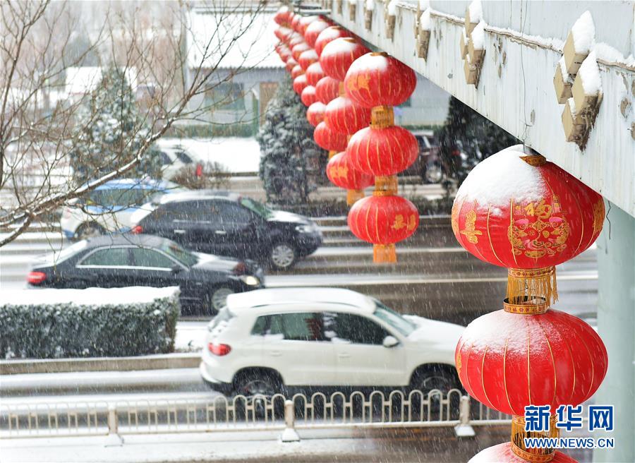 2月21日,大雪飄落在太原市濱河?xùn)|路路邊的燈籠上。當(dāng)日,山西省氣象局發(fā)布暴雪黃色預(yù)警,太原市區(qū)瑞雪普降。 新華社記者 曹陽(yáng) 攝