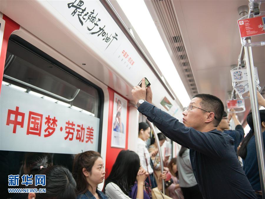 5月1日,全國(guó)勞模吳曉紅(右二)、劉志堂(左二)在“勞模地鐵專列”車廂內(nèi)與乘客合影。 “五一”勞動(dòng)節(jié)期間,一列“勞模地鐵專列”亮相長(zhǎng)沙地鐵1號(hào)線。該列車在車廂內(nèi)集中展示了由全國(guó)勞模、攝影家謝子龍拍攝的88位不同崗位全國(guó)勞模的肖像作品,旨在展示“勞動(dòng)最光榮、勞動(dòng)最崇高、勞動(dòng)最偉大、勞動(dòng)最美麗”的精神。新華社發(fā)(陳思維 攝) -