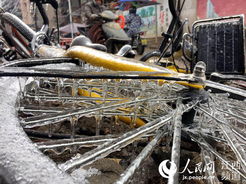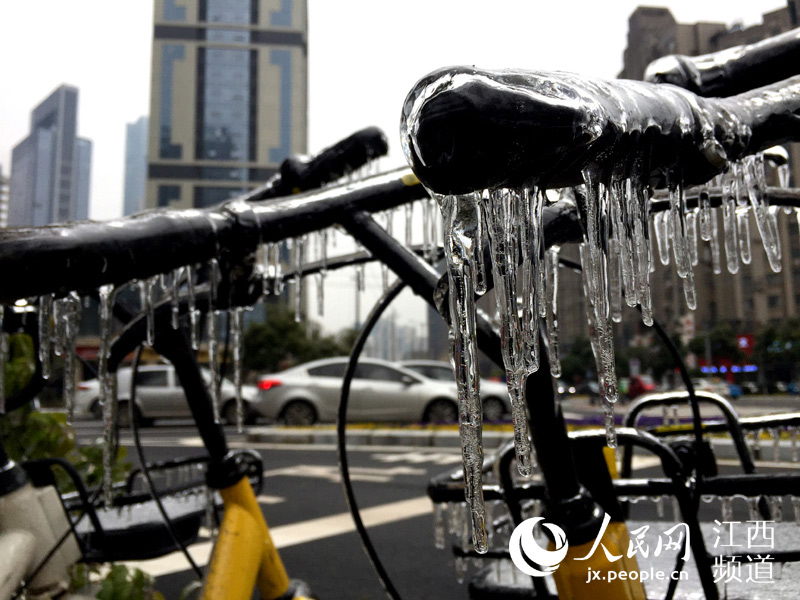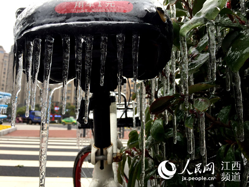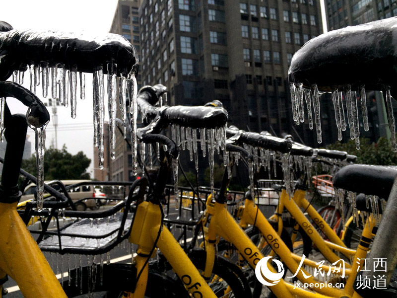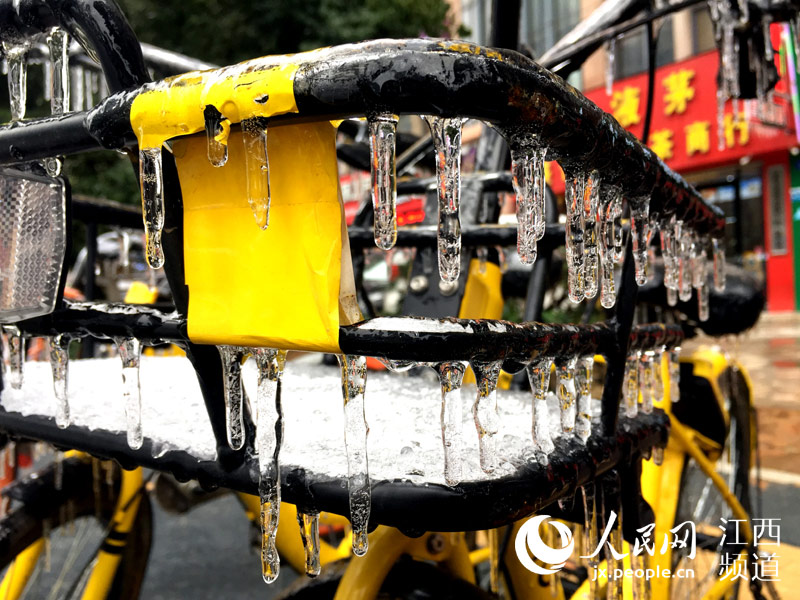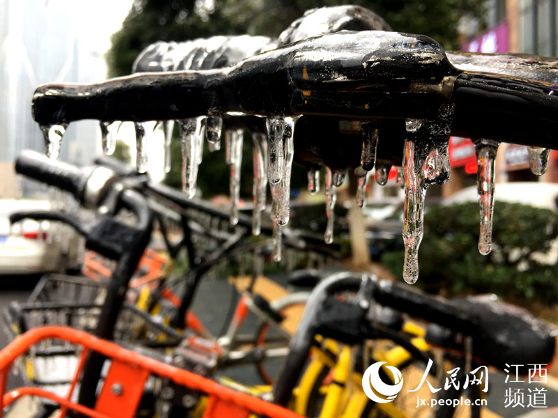 人民網(wǎng)南昌1月28日電(時(shí)雨)連日來(lái),南昌遭遇低溫凍雨天氣,夜間的溫度跌至0℃以下。28日,本網(wǎng)在南昌街頭看到,低溫加凍雨使戶外的物體裹上了厚厚的“冰衣裳”,散落在街頭的各類共享單車不少已經(jīng)成為“冰雕”,車把手、車筐甚至車輪胎都結(jié)了冰,這些被“冰封”的共享單車?吭诼愤厽o(wú)人問(wèn)津。 -