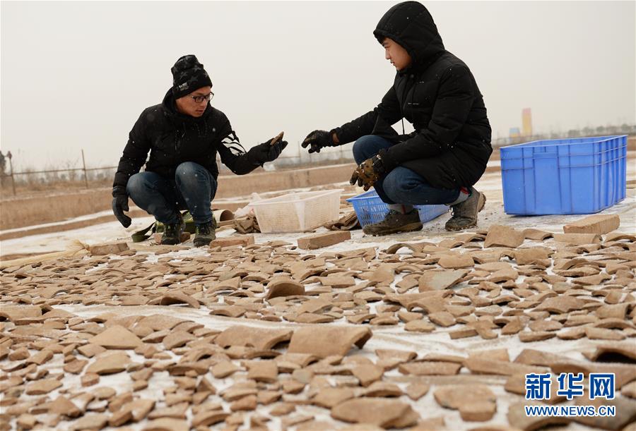 考古人員在秦咸陽城胡家溝建筑遺址考古工地上清理殘瓦(1月24日攝)。近日,考古工作者首次在秦咸陽城遺址區(qū)域內發(fā)現(xiàn)秦代大型國家府庫遺存。這是繼20世紀70至80年代發(fā)掘秦咸陽宮遺址以來,在秦咸陽大遺址保護區(qū)內再次發(fā)現(xiàn)秦代大型官署建筑遺址。此次發(fā)現(xiàn)的遺址位于陜西省西咸新區(qū)秦漢新城窯店鎮(zhèn),地處秦都咸陽城宮區(qū)以西的胡家溝塬地。遺址建筑四面為夯土垣墻,墻體厚度約3米,寬19.5米,總長110米。發(fā)掘過程中出土了數(shù)量眾多的石質編磬殘塊,目前已在23件殘塊上發(fā)現(xiàn)了小篆“北宮樂府”等字樣,再次證實了秦代設樂府的史實。新華社記者 李一博 攝 -
