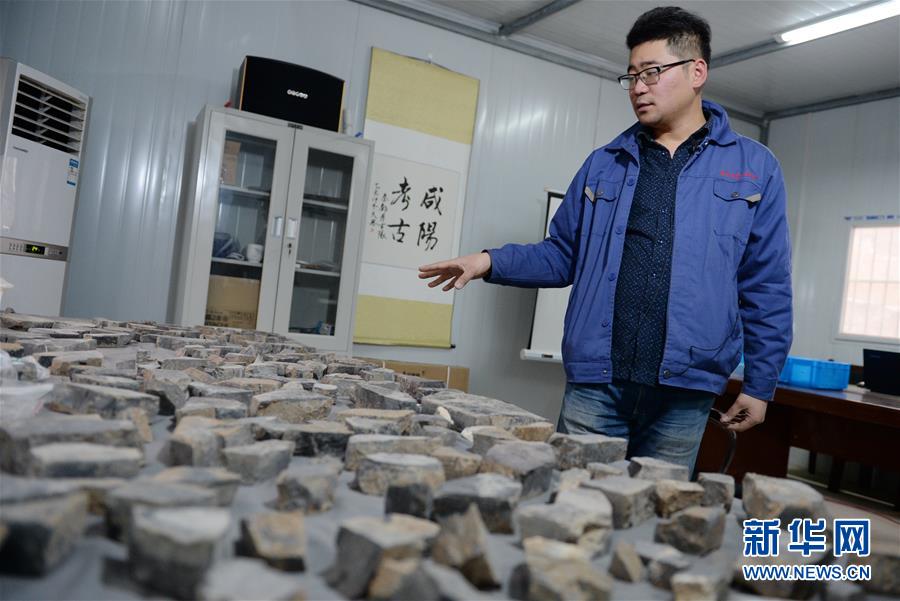 陜西考古研究院助理研究員張楊力錚介紹秦咸陽城胡家溝建筑遺址出土的石磬(1月24日攝)。近日,考古工作者首次在秦咸陽城遺址區(qū)域內發(fā)現(xiàn)秦代大型國家府庫遺存。這是繼20世紀70至80年代發(fā)掘秦咸陽宮遺址以來,在秦咸陽大遺址保護區(qū)內再次發(fā)現(xiàn)秦代大型官署建筑遺址。此次發(fā)現(xiàn)的遺址位于陜西省西咸新區(qū)秦漢新城窯店鎮(zhèn),地處秦都咸陽城宮區(qū)以西的胡家溝塬地。遺址建筑四面為夯土垣墻,墻體厚度約3米,寬19.5米,總長110米。發(fā)掘過程中出土了數(shù)量眾多的石質編磬殘塊,目前已在23件殘塊上發(fā)現(xiàn)了小篆“北宮樂府”等字樣,再次證實了秦代設樂府的史實。新華社記者 李一博 攝 -