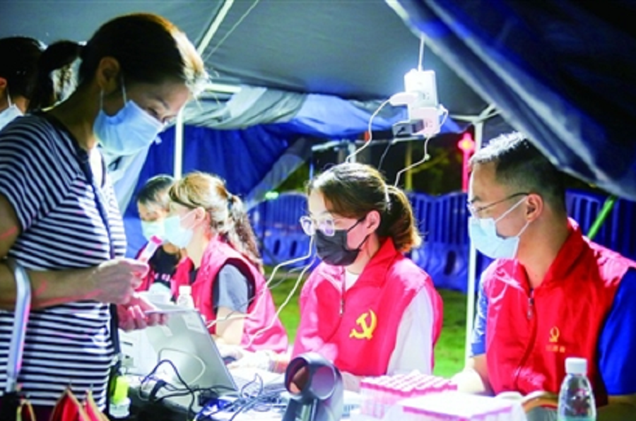 5月29日,黨員志愿者在嶺南明珠體育館核酸檢測點支援檢測工作。(央廣網(wǎng)發(fā) 謝曉 攝)