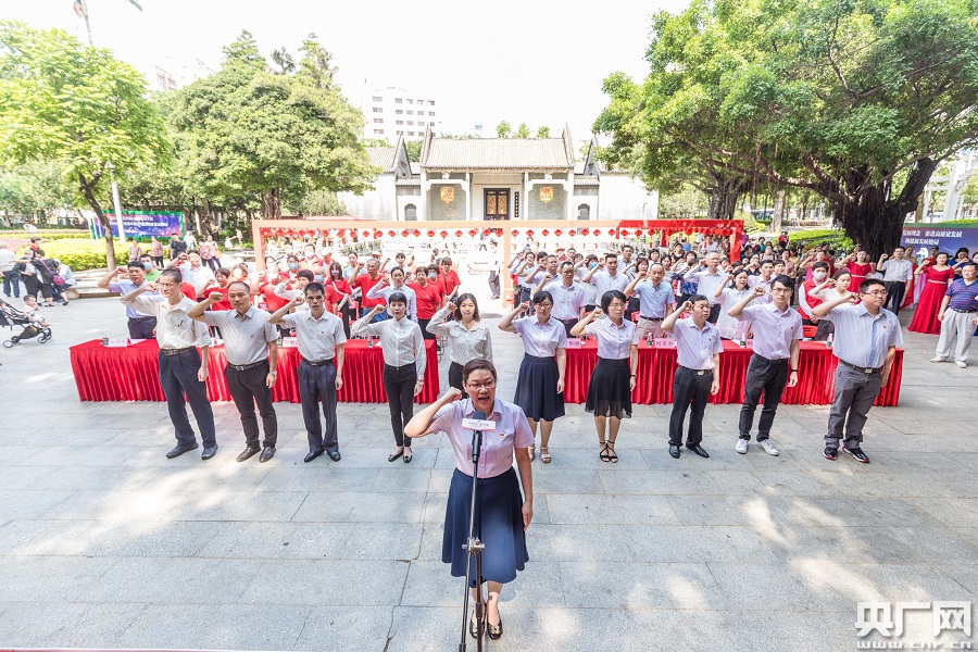 啟動儀式在全場黨員高舉右手重溫入黨誓詞的莊嚴(yán)氛圍中開始。(央廣網(wǎng)發(fā) 王偉楠攝)