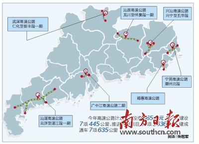 在按計(jì)劃取得整體用地批復(fù)的前提下,5月全線開工廣州新白云國(guó)際機(jī)場(chǎng)第二高速公路一期、廣佛肇高速公路廣州佛山段、中(山)開(平)高速公路江門段、懷(集)陽(yáng)(江港)高速公路懷集至郁南段一期、深圳至中山跨江通道深圳側(cè)接線工程等5項(xiàng);6月全線開工懷(集)陽(yáng)(江港)高速公路懷集至郁南段二期、潮汕環(huán)線高速公路二期、珠海鶴洲至高欄港高速公路一期、佛(山)江(門)高速公路和順至陳村段等4項(xiàng);7月全線開工梅州東環(huán)高速公路;8月全線開工廣州新白云國(guó)際機(jī)場(chǎng)第二高速公路二期、興(寧)汕(尾)高速公路五華至陸河段、(東)莞番(禺)高速公路橋頭至沙田段等3項(xiàng);9月全線開工羅(定)信(宜)高速公路、大(埔)豐(順)(五)華高速公路豐順至五華段等2項(xiàng);10月全線開工開(平)陽(yáng)(春)高速公路、玉湛高速公路一期、河惠莞高速公路河源紫金至惠州惠陽(yáng)段、河惠莞高速公路惠州平潭至潼湖段等4項(xiàng);11月全線開工深圳至中山跨江通道海中橋隧主體工程。