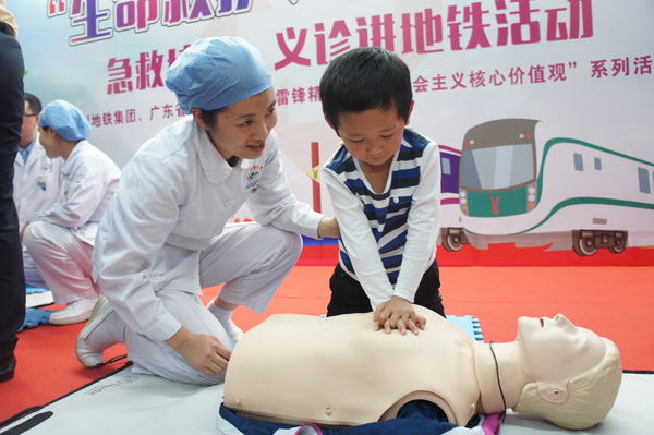 據(jù)南方網(wǎng)報(bào)道,乘坐地鐵時(shí),當(dāng)你身邊的人突然發(fā)病暈倒,該如何幫助他們?3月5日,在第五十五個(gè)學(xué)雷鋒紀(jì)念日到來之際,廣州地鐵集團(tuán)與廣東省中醫(yī)院攜手在公園前地鐵站舉辦了“生命救護(hù)、平安隨行 急救培訓(xùn)進(jìn)地鐵”活動(dòng),并在6座地鐵站現(xiàn)場開展急救培訓(xùn)和演練,將“急救白金十分鐘”的理念和技能“送”進(jìn)地鐵,讓車站人員和乘客掌握心肺復(fù)蘇急救術(shù),并在突發(fā)事件中能成為“急救醫(yī)師”。