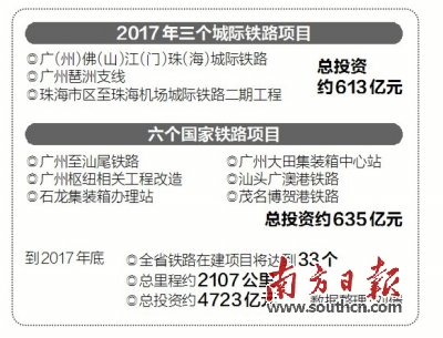這3個城際鐵路項目分別是廣(州)佛(山)江(門)珠(海)城際鐵路、廣州琶洲支線,以及珠海市區(qū)至珠海機場城際鐵路二期工程,總投資約613億元;6個國家鐵路項目分別是廣州至汕尾鐵路、廣州樞紐相關工程改造、石龍集裝箱辦理站、廣州大田集裝箱中心站、汕頭廣澳港鐵路、茂名博賀港鐵路,總投資約635億元。