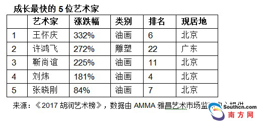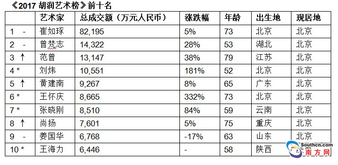 據(jù)南方網(wǎng)報道,73歲的書畫家崔如琢連續(xù)三年蟬聯(lián)胡潤藝術(shù)榜榜首,成交額比去年增長5%,再創(chuàng)新高,達(dá)到8.2億元;53歲的油畫家曾梵志總成交額1.4億元,比去年增長28%,衛(wèi)冕第二;79歲的國畫家范曾總成交額1.3億元,比去年增長38%,排名上升1位,重回第三……