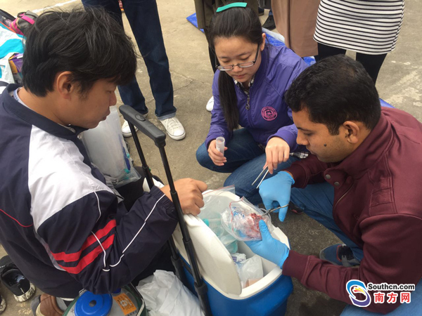 有專家在現(xiàn)場稱,“解剖發(fā)現(xiàn)有乳汁,這是一頭哺乳期母鯨”。據(jù)悉,解剖取樣可能持續(xù)到明天結束 。專家將對抹香鯨開展生理結構、分子生物學、生態(tài)及病理等方面的研究工作,分析死因,以期為抹香鯨這一瀕危種群的保護提供更多具有科學價值的數(shù)據(jù)和理論。圖為來自汕頭大學的專家在對抹香鯨的乳腺取樣。