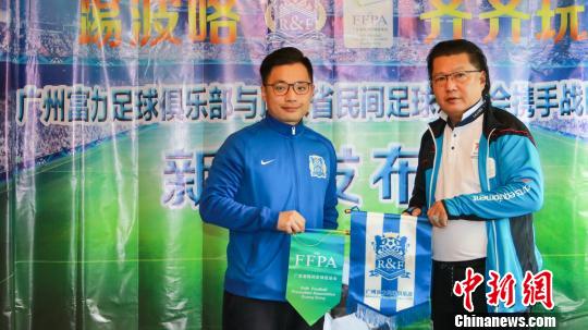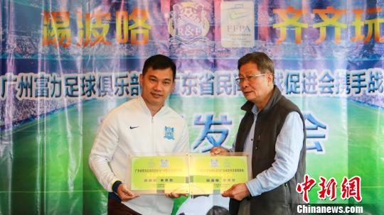 容志行(圖右)代表廣東民促會(huì)互贈(zèng)“廣東省民間足球促進(jìn)會(huì)與廣州富力足球俱樂部攜手戰(zhàn)略合作”牌匾!≡莱彙z