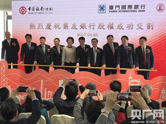 央廣網(wǎng)香港3月28日消息(記者周偉琪)廈門國(guó)際銀行股份有限公司(下稱“廈門國(guó)際銀行”)、福建省廈門市私立集美學(xué)校委員會(huì)(下稱“集美校委會(huì)”)與中國(guó)銀行(香港)有限公司(下稱“中銀香港”)在香港聯(lián)合舉行集友銀行股權(quán)成功交割儀式,慶祝集友銀行股權(quán)買賣所有工作全部順利完成。中央人民政府駐香港特別行政區(qū)聯(lián)絡(luò)辦公室副主任仇鴻,福建省委常委、常務(wù)副省長(zhǎng)張志南,中國(guó)銀行行長(zhǎng)陳四清,香港金融管理局副總裁阮國(guó)恒,中國(guó)銀行副行長(zhǎng)任德奇,中銀香港副董事長(zhǎng)兼總裁岳毅,廈門市委常委、廈門統(tǒng)戰(zhàn)部部長(zhǎng)兼集美校委會(huì)主任張燦民、廈門國(guó)際銀行總裁呂耀明、集友銀行管理層代表及社會(huì)各界人士參加了儀式。香港福建社團(tuán)聯(lián)會(huì)吳良好主席等福建鄉(xiāng)賢、香港各界人士、集友銀行客戶及員工代表等亦蒞臨儀式現(xiàn)場(chǎng),共同見(jiàn)證集友銀行在發(fā)展史上揭開(kāi)新的一章。