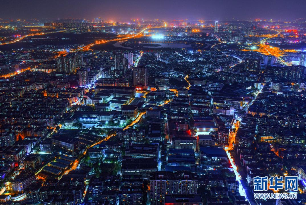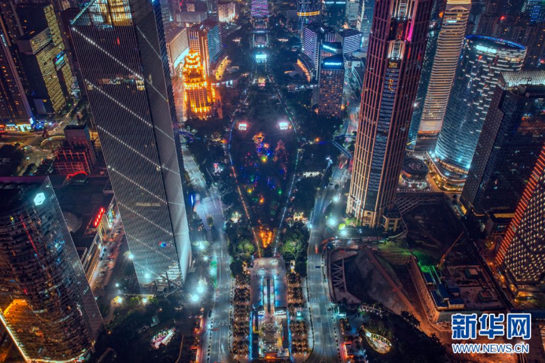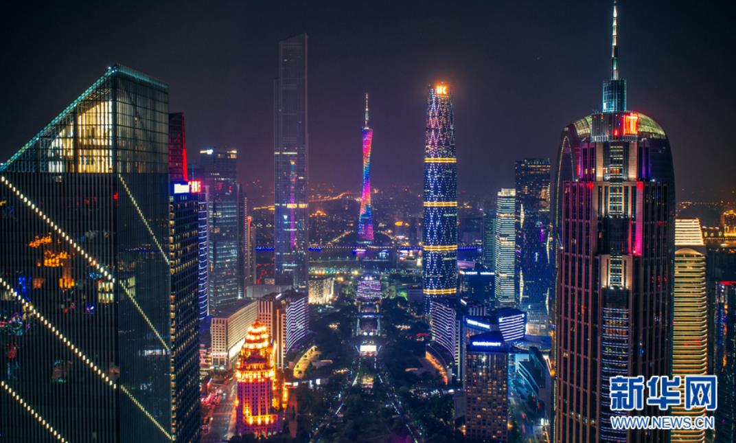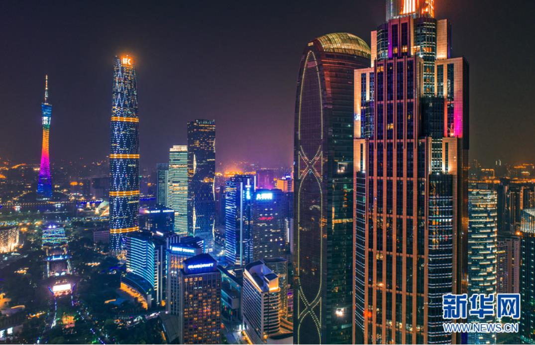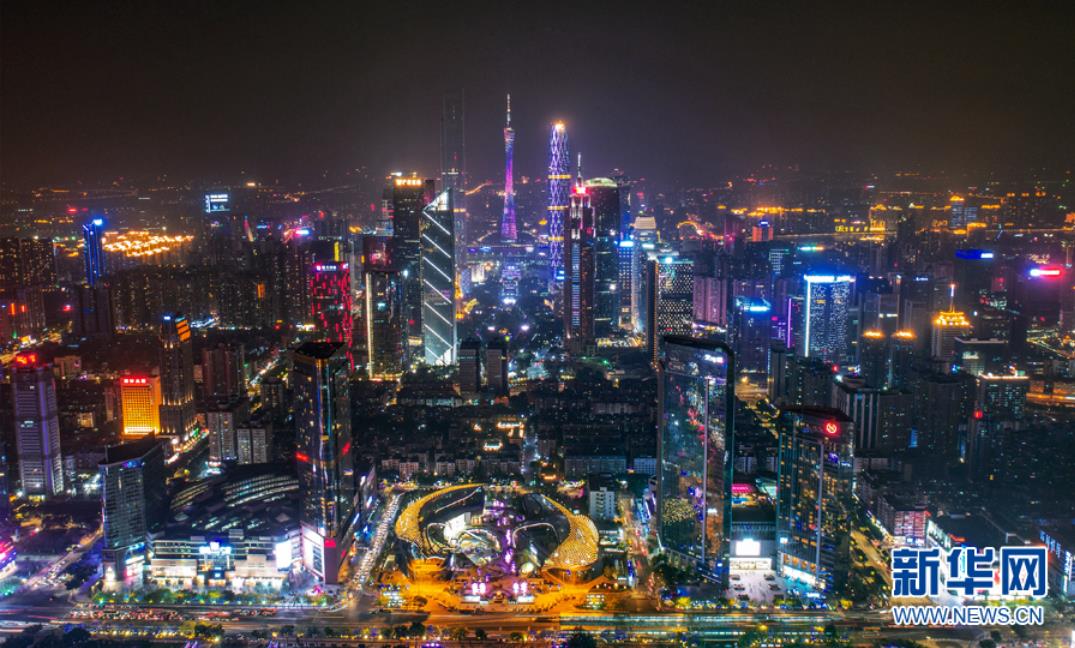 從高空俯瞰夜色中的珠江新城,現(xiàn)代化高樓林立,燈光璀璨。新華網(wǎng)發(fā) (伍定文 攝)