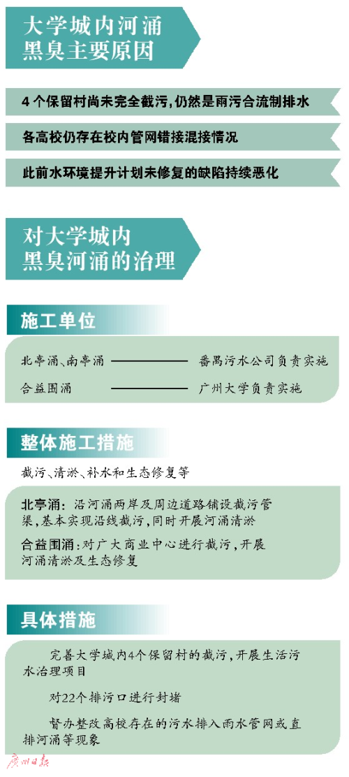 番禺區(qū)有關負責人表示,針對大學城內(nèi)3條黑臭河涌,采用截污、清淤、補水和生態(tài)修復等多種措施,開展黑臭水體治理項目。其中北亭涌、南亭大社涌由番禺污水公司負責實施,合益圍涌由廣州大學實施。3宗項目均在2016年8月啟動,目前正在開展前期工作。