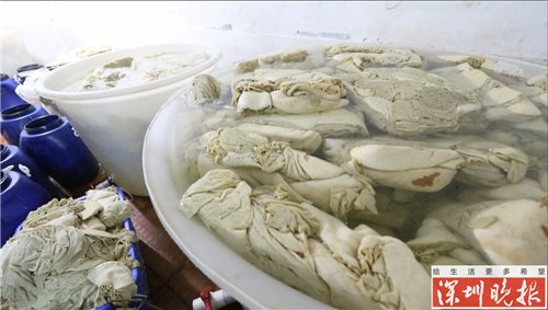 進(jìn)入順平的加工廠后,出現(xiàn)在民警眼前的,是十多個(gè)直徑 2 米的塑料大桶,每個(gè)桶都密密麻麻浸泡著牛百葉,F(xiàn)場(chǎng)不僅發(fā)現(xiàn)了雙氧水等原材料,還有準(zhǔn)備浸泡的發(fā)霉發(fā)臭的牛百葉。" 味道很刺鼻,現(xiàn)場(chǎng)的工人都穿高筒水靴、帶防化服和手套,他們也知道如果不戴,久了皮膚會(huì)爛。" 民警介紹。