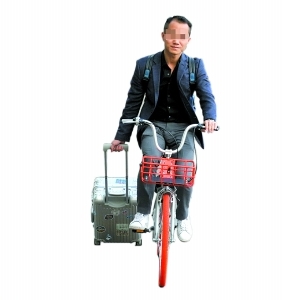 沿江路,拖著行李箱單手騎車(chē)的男子