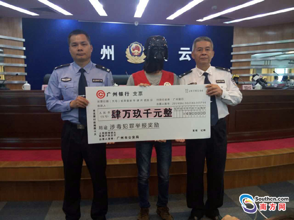 南方網(wǎng)訊 4月20日,戴著面具的“白云快遞小哥”從廣州白云區(qū)公安分局一級警長張海興手中接過4.9萬元的獎勵金。這位“快遞小哥”近期舉報(bào)一條涉賭線索幫助白云警方偵破一宗利用物流運(yùn)輸毒品至外國的案件,從一批準(zhǔn)備運(yùn)往東南亞的書包中繳獲冰毒。根據(jù)《廣州市公安局舉報(bào)毒品違法犯罪獎勵辦法》,這名“白云快遞小哥”被白云警方獎勵4.9萬元。