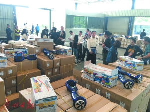 深圳海關(guān)查獲的涉嫌侵權(quán)的一批電動(dòng)平衡車(chē)。 廣州日?qǐng)?bào)全媒體記者軒慧攝