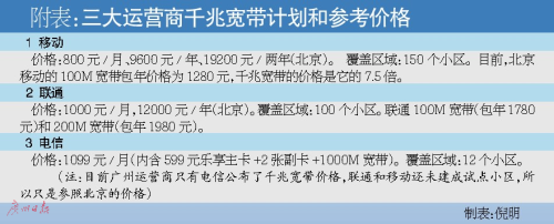 廣州日報記者調(diào)查后發(fā)現(xiàn),千兆寬帶普及還需時日。首先,千兆寬帶仍處于推廣初期,覆蓋范圍有限且費用較高(見附表)。其次,享受千兆寬帶的服務(wù),必須用戶升級家中的相關(guān)硬件,如光貓、路由器、網(wǎng)線和網(wǎng)卡等。