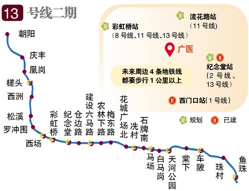 人民路與東風路的交界處,可謂地鐵“盲區(qū)”:以十字路口為圓心,未來周邊1公里范圍內(nèi)將有4條地鐵線、4個地鐵站——1號線(西門口站)、8號線(彩虹橋站)、11號線(彩虹橋站、流花路站)、13號線(彩虹橋站、紀念堂站),但最近的車站都要步行約1公里。13號線二期經(jīng)過而不設站,周邊街坊覺得尤為遺憾。