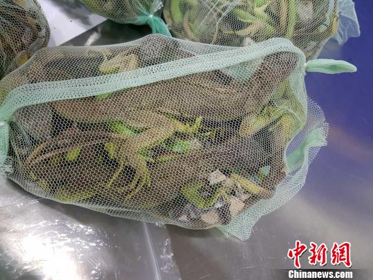 在當(dāng)事人的背包中,關(guān)員發(fā)現(xiàn)了10個綠色的網(wǎng)兜,每一個網(wǎng)兜中都裝著10只左右的活體蜥蜴。