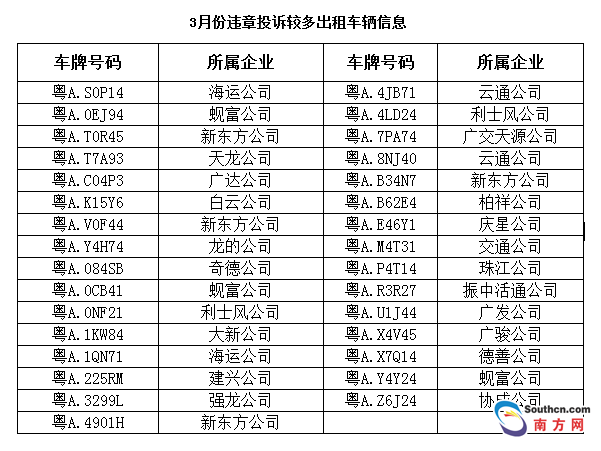同時(shí),廣州市交通部門(mén)還公布了3月份違章投訴較多的出租車(chē)輛信息。海運(yùn)、云通、蜆富等公司的31輛出租車(chē)上了“黑榜”,詳見(jiàn)下表: