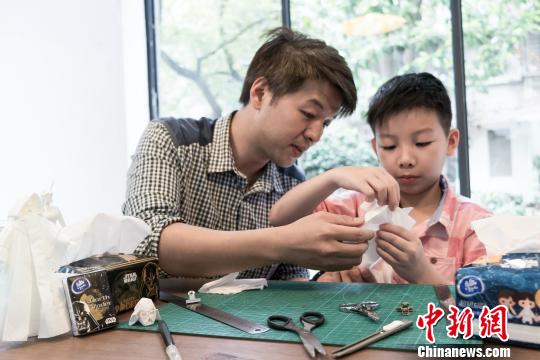 4日,廣州80后父子正在用紙巾制作著名科幻電影《星球大戰(zhàn)》人物模型!∪A逸 攝