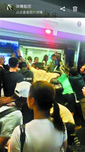 一名乘客在車廂里幫助女乘客把右腿拔出來。(圖片來自網(wǎng)友朋友圈截圖)