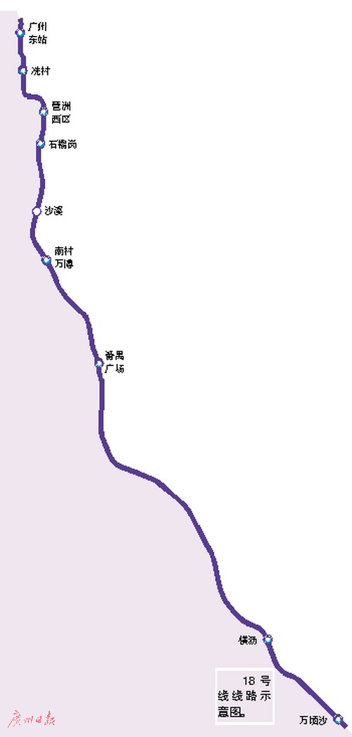 線路北起廣州東站、南至萬頃沙樞紐,總長(zhǎng)62.5公里,設(shè)站9座,平均站間距超過7公里。為實(shí)現(xiàn)廣州市中心與南沙副中心30分鐘快速直達(dá)的時(shí)空目標(biāo),線路采用了最高時(shí)速160公里的系統(tǒng)制式,線路走向盡可能拉直及嚴(yán)格控制沿線車站設(shè)置數(shù)量。