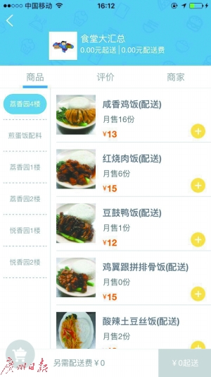 記者下載了該訂餐軟件,在該外賣平臺(tái)上,共有五個(gè)可供學(xué)生選擇的窗口,分別是悅香園二樓、荔香園二樓、荔香園四樓、荔香園一樓和悅香園一樓。每個(gè)窗口提供3~9種餐食,包括水餃、拉面、米飯粥等。除配送外,這些窗口還可以選擇打包自取。同樣的餐食如果自取,將會(huì)優(yōu)惠1.5元。該平臺(tái)公告欄上顯示,食堂提供的送餐服務(wù)僅僅是中餐和晚餐飯點(diǎn)的配送。而且據(jù)了解,“校食易”上的一些菜式是窗口沒有的。