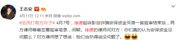 根據(jù)王志安4月11日發(fā)布的微博顯示,徐波起訴彭劍詐騙一案已經(jīng)進(jìn)入庭審階段。該案有待進(jìn)一步審理。