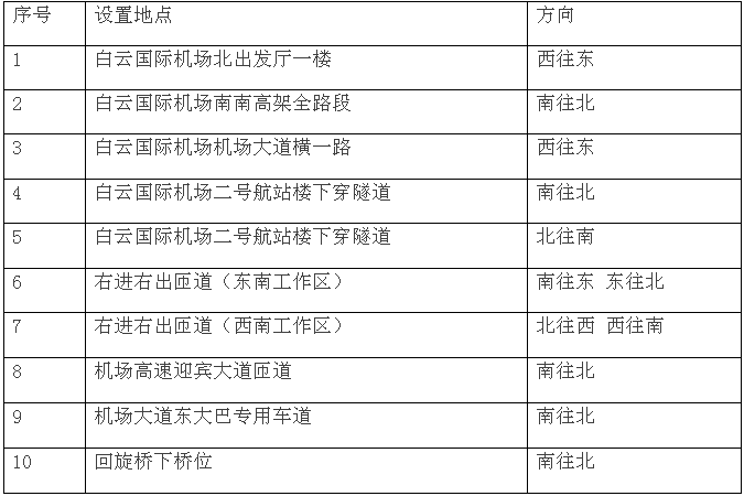 為進(jìn)一步加強(qiáng)廣州白云國(guó)際機(jī)場(chǎng)的交通安全管理,規(guī)范道路交通通行秩序,保障人民群眾生命財(cái)產(chǎn)安全。交警部門(mén)根據(jù)《道路交通安全違法行為處理程序規(guī)定》(公安部令105號(hào))第十六條規(guī)定,現(xiàn)將近期啟用的18套固定式交通技術(shù)監(jiān)控設(shè)備設(shè)置地點(diǎn)向社會(huì)進(jìn)行公告。該批設(shè)備具備對(duì)違反禁令標(biāo)志,超速行駛等多種交通違法抓拍功能,將于2017年5月19日開(kāi)始啟用,請(qǐng)廣大駕駛員守法出行、安全駕駛。