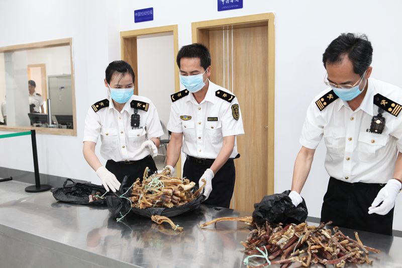 關(guān)與檢驗檢疫的工作人員共同對查獲鹿鞭、鹿角、鹿筋等動物產(chǎn)品進行清點